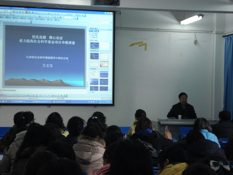 2012年2月28日下午2点半,江西省社联副巡视员、江西省社科规划办公室副主任王玉宝莅临leyu·乐鱼(中国)体育官方网站,在名达楼1415多媒体教室举办了题为“优化选题、精心论证,着力提高社科基金项目的申报质量”的学术报告。讲座围绕四个方面展开:1、社会科学规划的作用和任务。2、国家社科基金项目的基本情况。3、省级社科规划工作的基本情况。4、关于社科基金项目的申报、立项和管理。