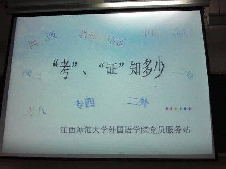 2012年5月10日晚上7点,leyu·乐鱼(中国)体育官方网站党员服务站在惟义楼7101举办了“考”、“证”知多少讲座。外国语leyu·乐鱼(中国)体育官方网站11级全体学生以及外国语leyu·乐鱼(中国)体育官方网站党员服务站全体成员出席了此次讲座。