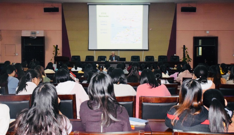 11月6日晚,法国高等商leyu·乐鱼(中国)体育官方网站文化与传播荣誉教授Jean-Rémy Bure 应邀在leyu·乐鱼(中国)体育官方网站三楼报告厅做题为 《畅游法兰西:“风景鉴赏”》 (Voyage en France : lecture de paysages)的讲座。讲座由法语系教师林海平博士主持,全体法语系学生、校内法语学习同学、非洲留学生和校外师生到场聆听讲座。
