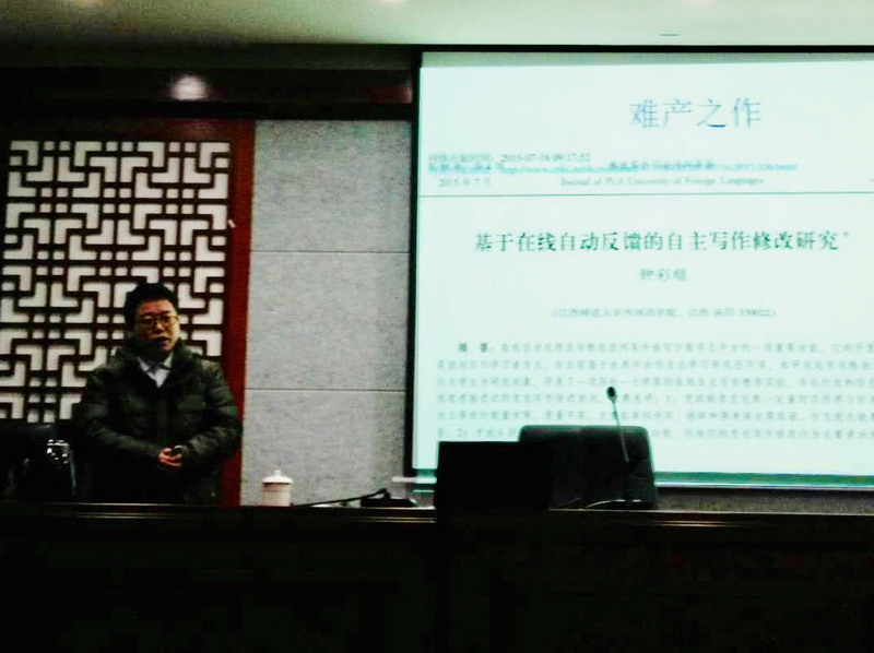教师代表钟彩顺、赵海涛博士与全体人员分享了科研经验。钟彩顺博士以“难产之作”、“惊喜之作”、“异想之作”和“随兴之作”为题,讲述了他一篇篇选题各异的高端论文的问世经历,给与会者留下了深刻的印象;赵海涛博士分享了他在繁重的教学和家务之余能使科研成为常态的经验,他不到四年获批课题6项、出版译著十余本的速度令人咂舌,凌晨4点钟起床做科研的做法让人望尘莫及。