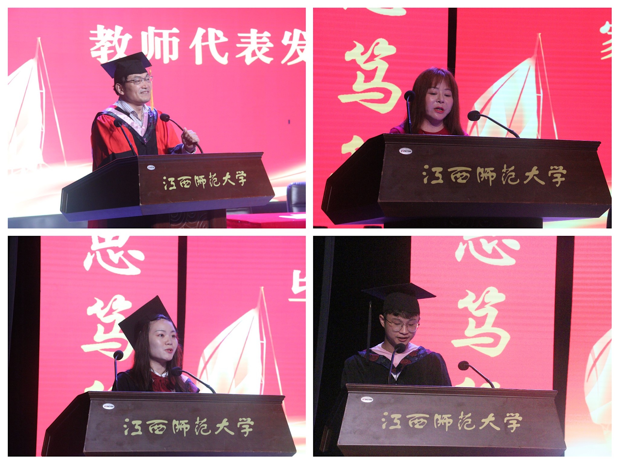 教师代表唐伟胜、家长代表张晓兰、毕业生代表刘诗雨分别作了发言。唐伟胜教授希望毕业生在人生的征途中敢于表达爱、敢于追求、敢于拼搏;张晓兰对外国语leyu·乐鱼(中国)体育官方网站全体教师“捧着一颗心来,不带半根草去”的精神感动,对外国语leyu·乐鱼(中国)体育官方网站在学生培养中的倾心付出表示感谢;刘诗雨表达了对母校、母院、老师及亲人的感恩之情以及对未来的美好憧憬。