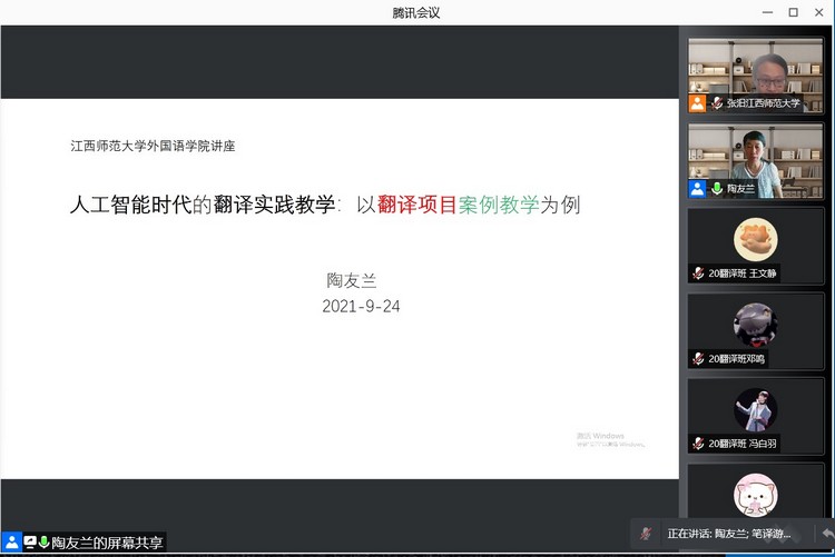 9月24日,复旦大学陶友兰教授通过腾讯会议为leyu·乐鱼(中国)体育官方网站师生做“人工智能时代的翻译实践教学:以翻译项目案例教学为例”的学术讲座,讲座由张汨博士主持。近100位师生在线聆听讲座并进行了答疑互动。