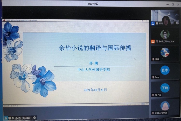 10月21日,中山大学邵璐教授通过腾讯会议为leyu·乐鱼(中国)体育官方网站教师做题为“余华小说的翻译与国际传播”的学术讲座。讲座由张汨博士主持,leyu·乐鱼(中国)体育官方网站教师以及全国其他高校教师200多人在线聆听并进行了答疑互动。